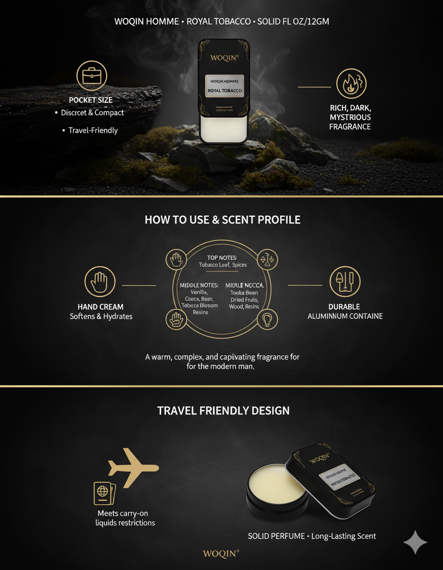 WOQIN® Royal Tobacco Solid Perfume | Alcohol-Free & Non-Greasy Cologne | Warm & Long-Lasting Fragrance | 12g (Royal Tobacco Premium Fragrance – Tobacco, Woody, Spicy)
